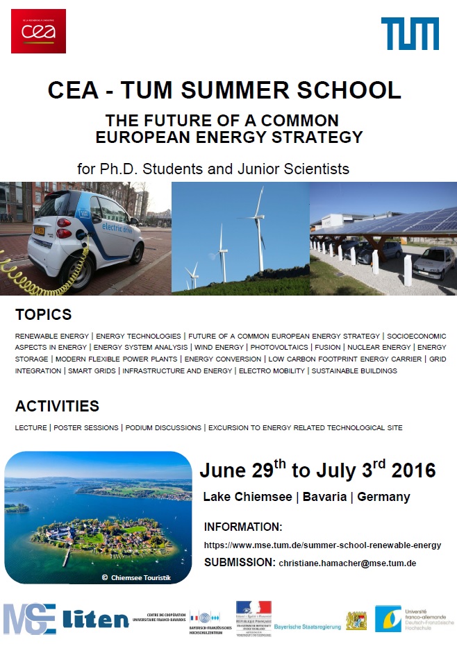 - Université d'été franco-allemande pour jeunes chercheurs : "Future of a common European energy strategy" du 29 juin au 3 juillet 2016, sur l'île Frauenchiemsee, en Bavière.